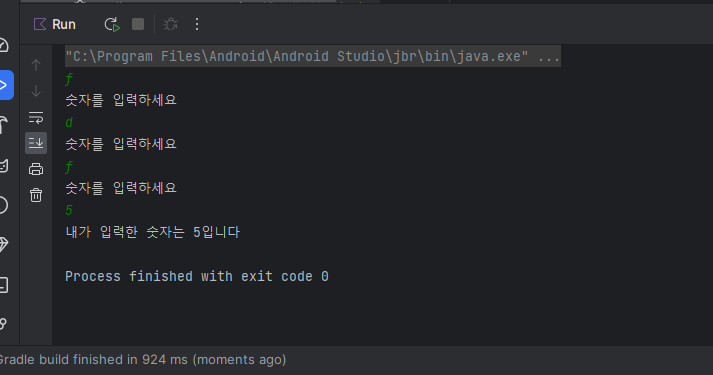 원래 숫자만 받는 toInt를 가졌을 때 숫자가 아닌 다른 것을 입력한다면 컴파일 에러, Exception in thread "main" java.lang.NumberFormatException 이라는 문구가 뜨면서 에러가 나는것을 볼 수 있다.