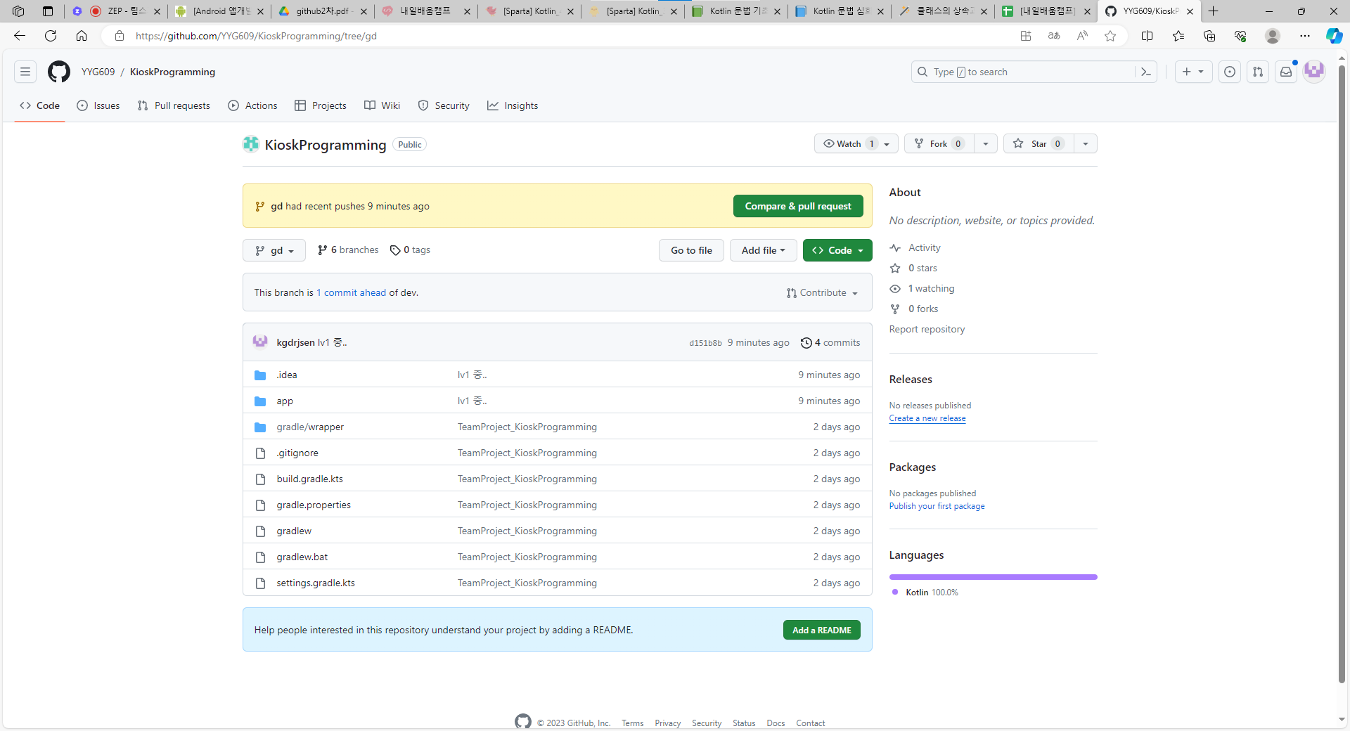 이제 팀장님이 만든 레포지토리를 클론해서 가져오고 내 이니셜로 만든 브랜치를 만들고 여기다가 푸쉬를 했는데 잘 올라간 모습이다.