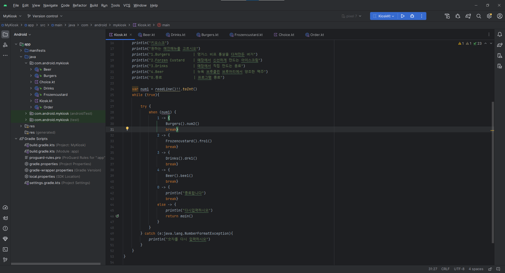 오늘 키오스크 과제에 바로 대입하여 다른번호가 뜨면 다시 입력하시오 밑에 문자를 썼을 때 오류가 나는 것을 막는 예외처리를 할 수 있었다.