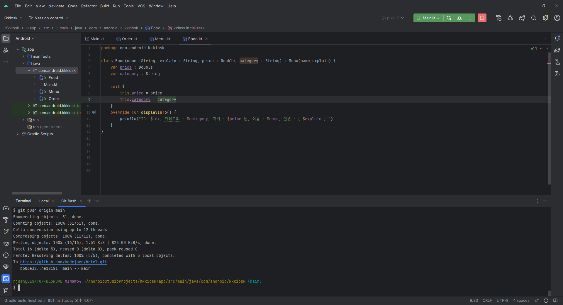 -실패...오류는 하나만 떴다. 푸드 클래스의 생성자가 문제라고 자꾸 뜬다. 결국 init에 대해 찾아보니 this를 붙이고 받아주면 되는데 내가 계속 오류났던건 번호를 붙이기 위해 넣었던 idx쪽이 문제였다. 결국 메뉴 클래스에서 부터 오더 클래스에 넣었던 컴페니언 오브젝트를 넣고 idx라고 붙였던 번호를 내가 쓰는게 아닌 얘가 알아서 실행하게끔 했다.