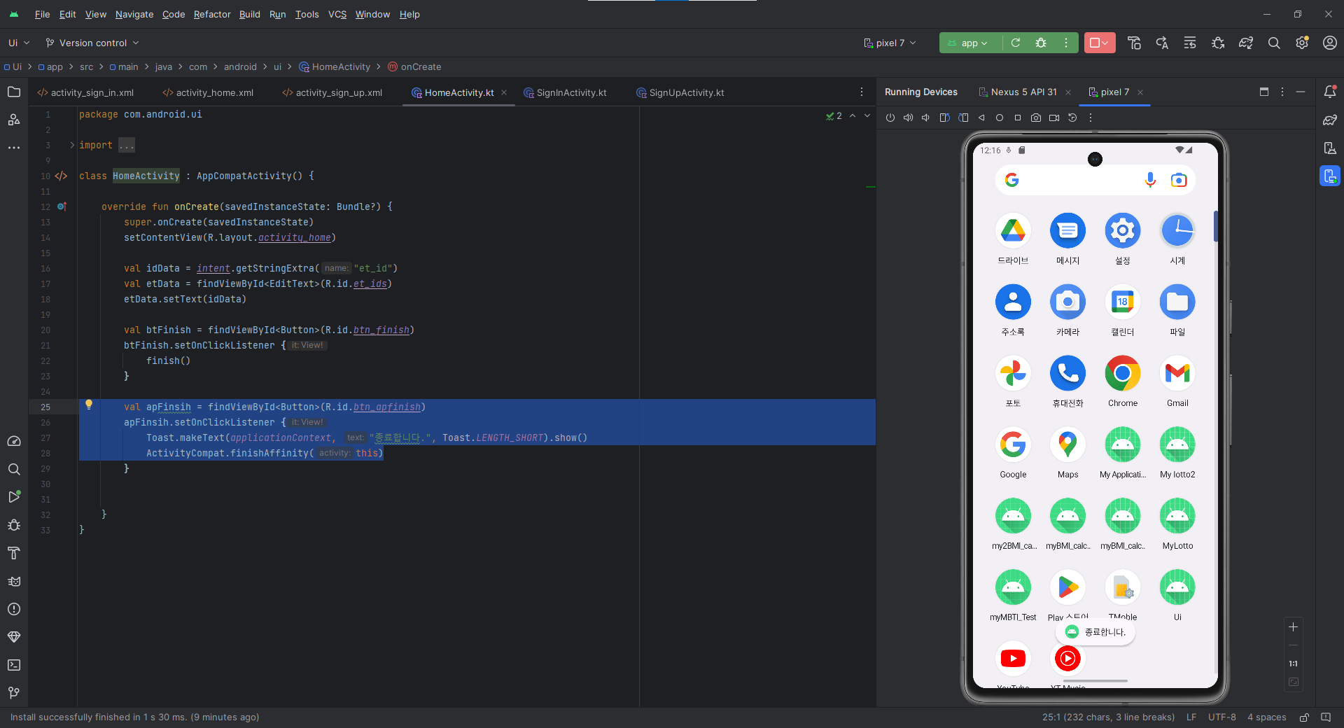 - 종료 버튼이 눌리면 SignInActivity로 이동합니다. (finish 활용)