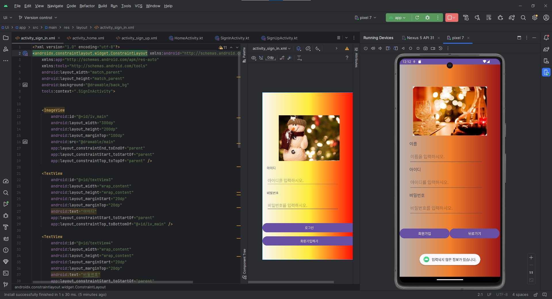 세 페이지 모두 각각 백그라운드 xml을 따로 만들어서 그라데이션 색깔을 집어넣었고 마지막 홈엑티비티에는 강의에서 들었던거처럼 큰 레이아웃 안에 집어넣고 안에 들어간 레이아웃에 마진을 좀 줘서 큰 레이아웃의 색깔이 튀어나오게끔도 만들어보았다. 일단 여기까지 내가 생각하는 lv3까지는 구현을 한거 같다. 다만 선택과제는 아무리 인터넷에 쳐도 좀 힘든거 같다. 내일 튜터님한테 이건 진짜 물어봐야할거 같다.