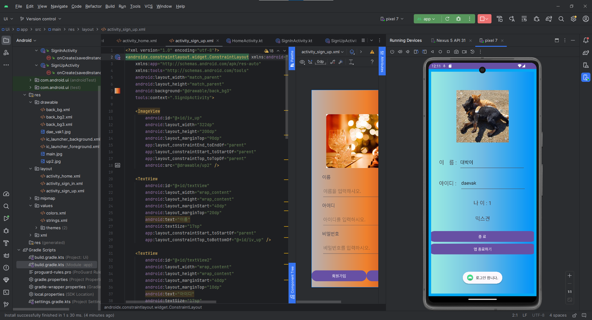 로그인을 하면 로그인 화면에서 입력했던 아이디를 받아와서 넣는 기능을 넣어뒀고 여기에 추가적으로 찾다보니 앱을 종료하는 명령어가 있길래 한번 같이 집어넣어보았다.