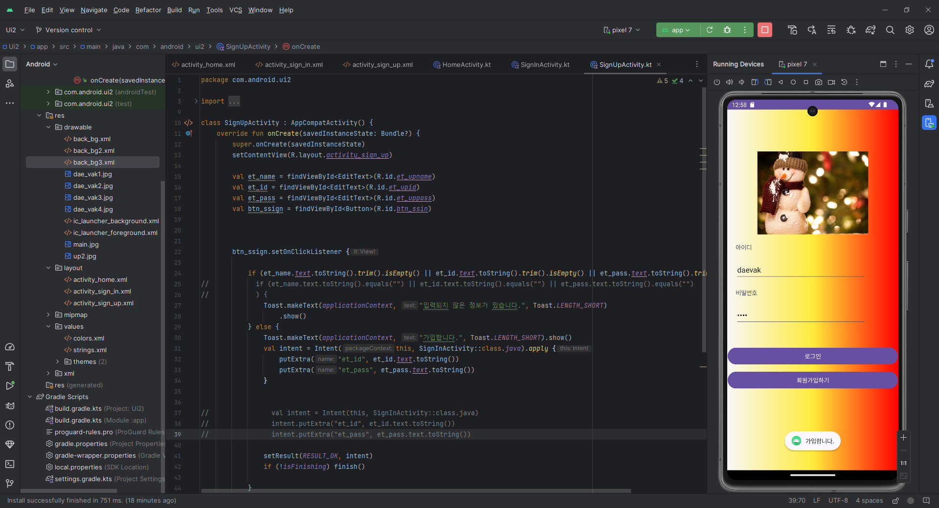 이제 setResult() 를 만들어주고 RESULT_OK이고 인텐트를 하게 해준뒤 finish() 로 회원가입 화면을 꺼주면 된다.