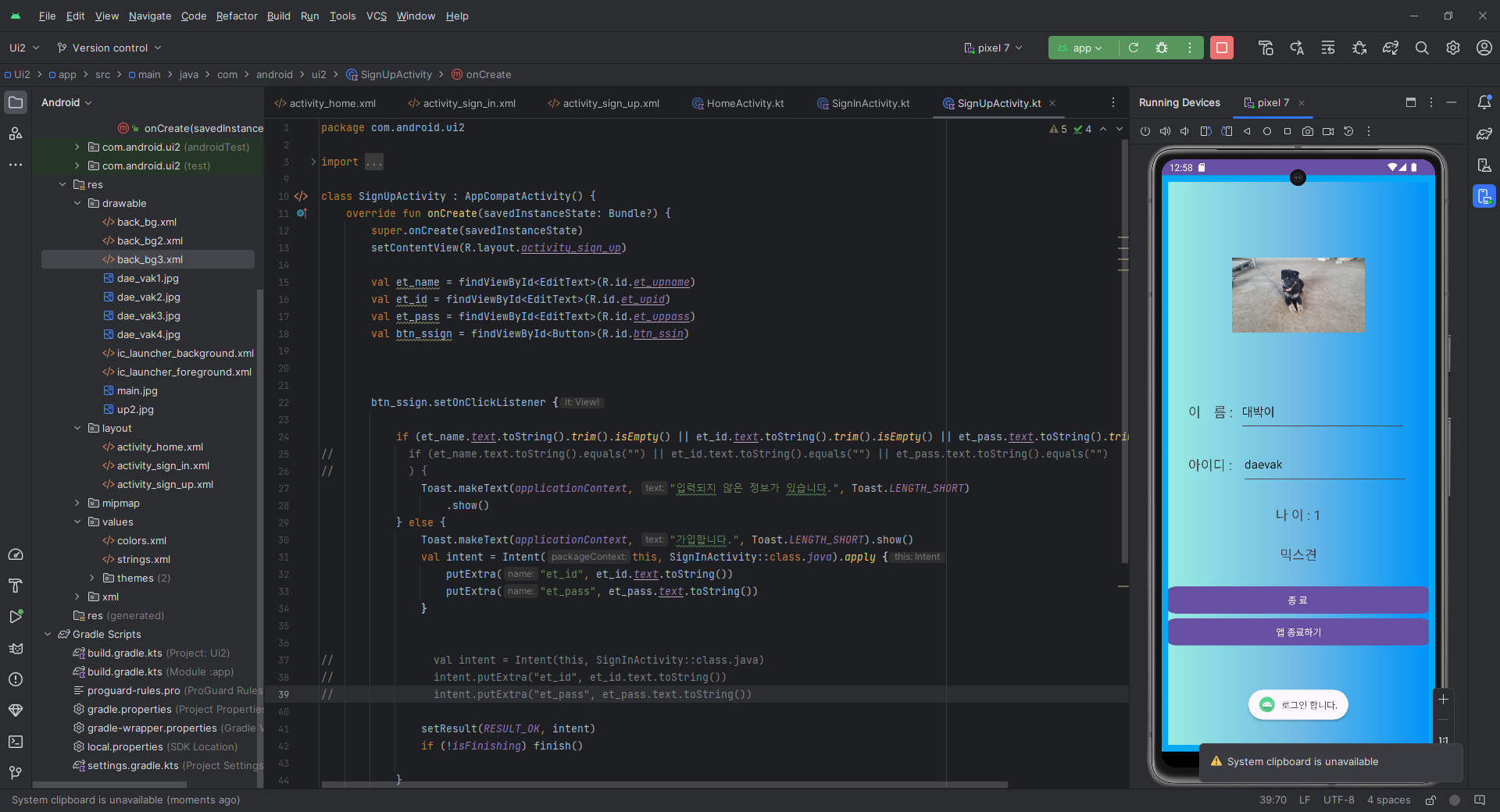 요거를 signin액티비티의 if문 바로 바깥에 넣었는데 이게 아니라 이걸 버튼에 넣었어야 했다.엉뚱한 삽질...