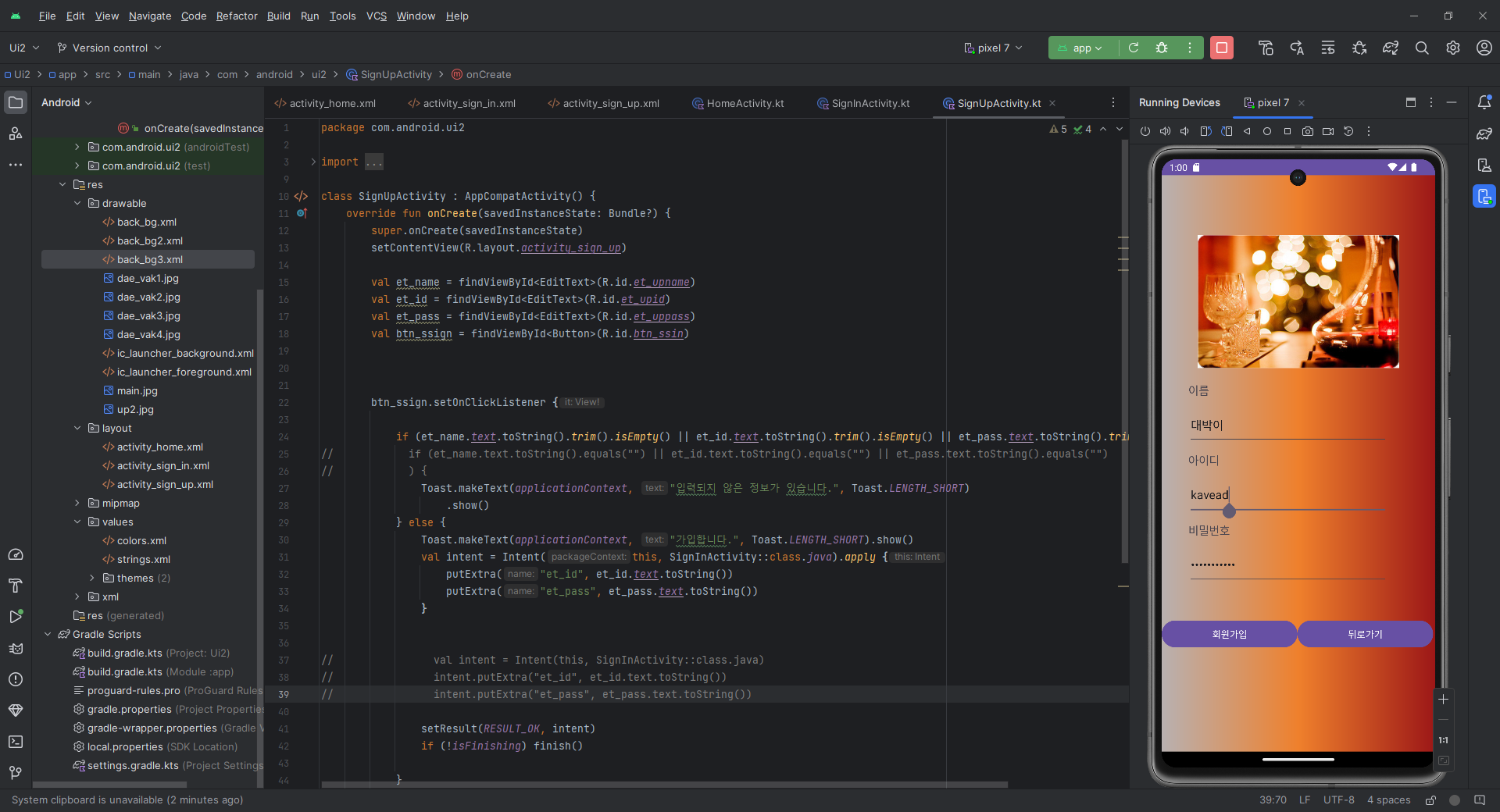 이거도 종료하지 않고 한건데 잘 따라온다. 다만 아쉬운건 home 액티비티에서 종료를 누르고 초기 화면으로 돌아왔는데 초기화가 되지 않고 회원가입창에서 받았던거 그대로 남아있던게 아쉬운거 같다. 이거 내일 제출 전에 한번 여쭤봐야겠다.