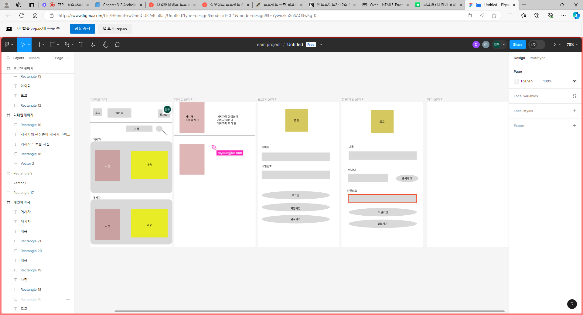 들어가서보니 가입도 간단하여 만들고 팀원들을 초대해서 다 같이 작성하였다. 중간에 코멘트로 여기에 어떤 부분을 첨가하면 좋겠다 같은 내용을 넣을 수도 있어서 이 피그마가 팀원들과 함께 작업하기에 좋은거 같았다. 다만 다들 처음이라 그림판에서 그렸던 것과 마찬가지로 좀 그렇긴 하지만 일단 틀은 잡았다.