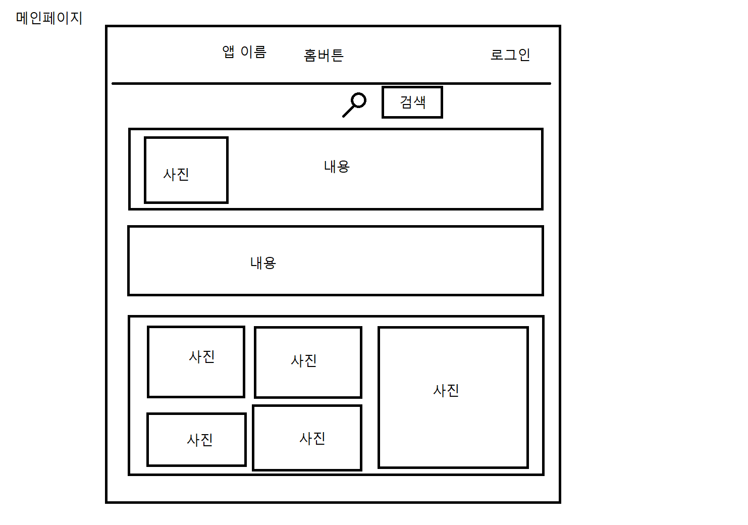 대충 그리고 이런식으로 해보자고 일단 그림판으로 조잡하지만 그려서 틀을 만들었다. 그런데 다 같이 어떤 걸 빼고 넣고 할 수 없는 단점이 있어서 아까 발제 때 들은 피그마를 사용해보기로 했다.