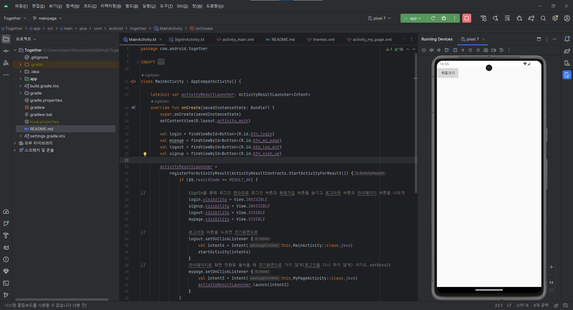 우선 만들어 놓은 버튼 로그인과 로그아웃을 겹쳐 두고, 회원가입과 마이페이지 버튼을 서로 겹쳐 두었다. 그리고 이제 코틀린 파일로 가서 버튼들을 선언 해 주고 우선 로그아웃과 마이페이지는 초기화면에서 보이면 안되니