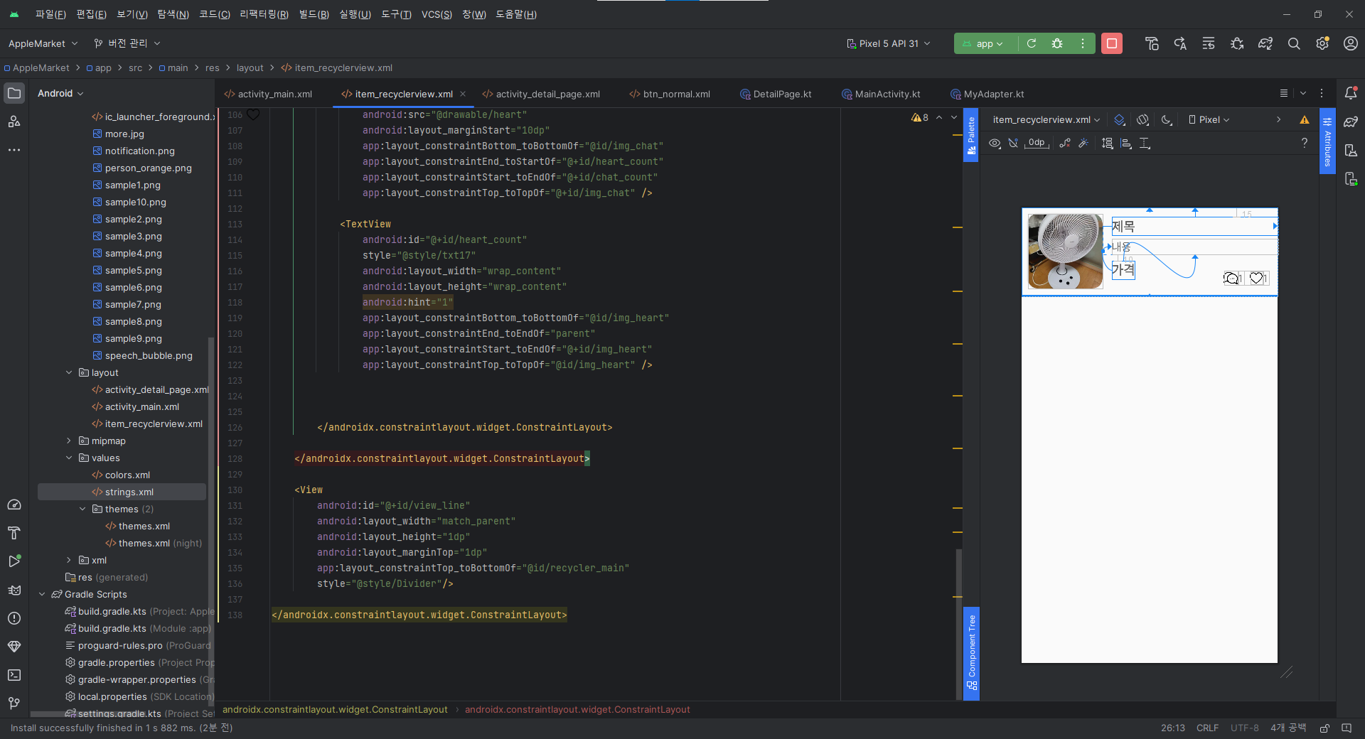 메인 xml에서는 리사이클러뷰 하나만 넣어두고, 다시 따로 리사이클러 xml을 만들어서 우선 계속 재사용 할 칸을 만들어 줬다.