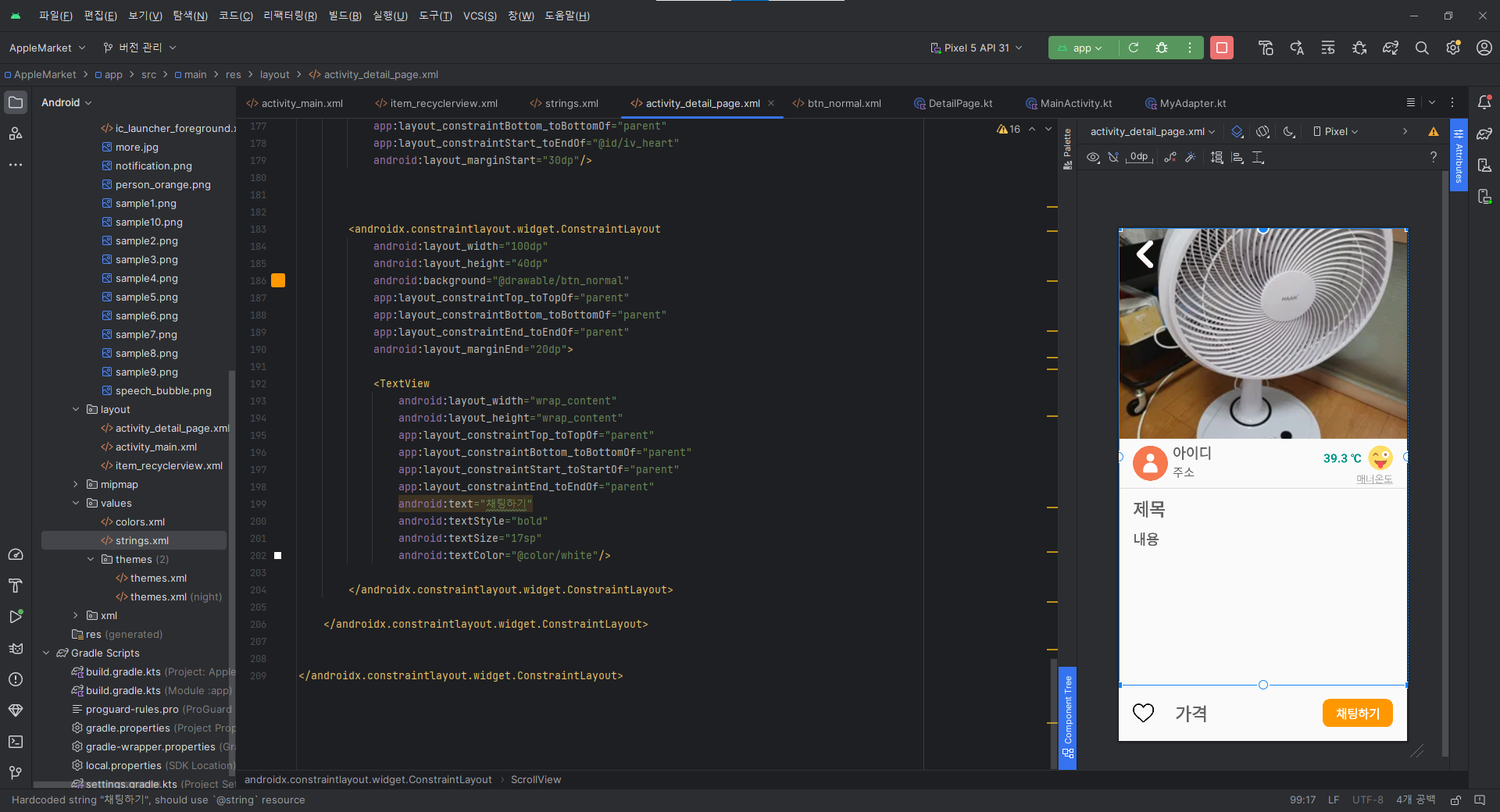 이미지 모서리를 둥글게 처리하는건 카드뷰라는 뷰 안에 이미지뷰를 꽉 차게 넣어주고 카드뷰에 레디우스를 줘서 모서리를 깎았다.