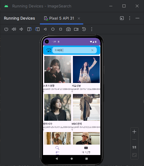 이렇게 api키를 넣어주고 검색할 내용을 param으로 해서 리스트로 아이템들을 가져오는 함수를 만들고 검색기능도 search view를 활성화 시키기 위해 setOnQuertTextListener라는 함수를 추가적으로 만들었다.